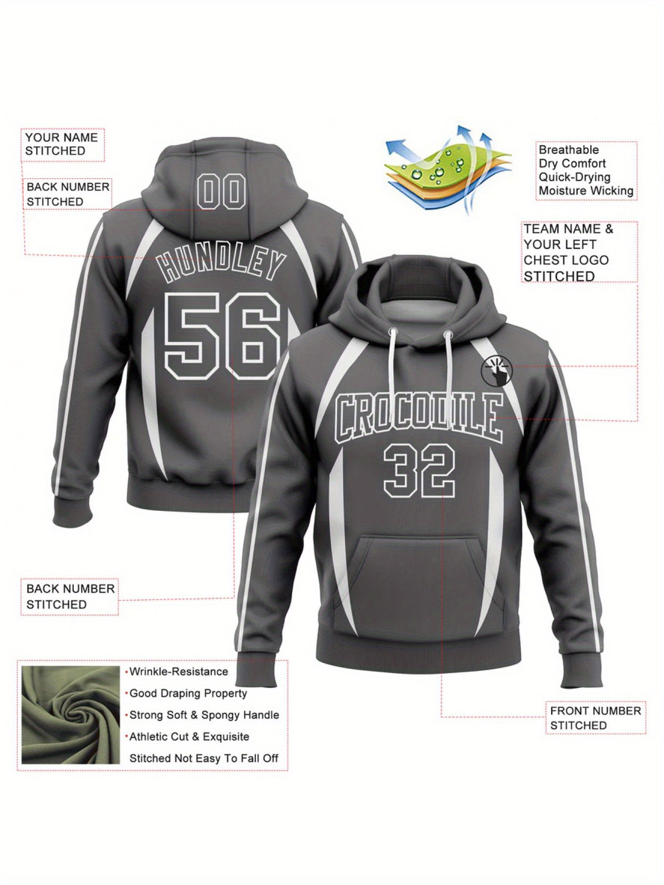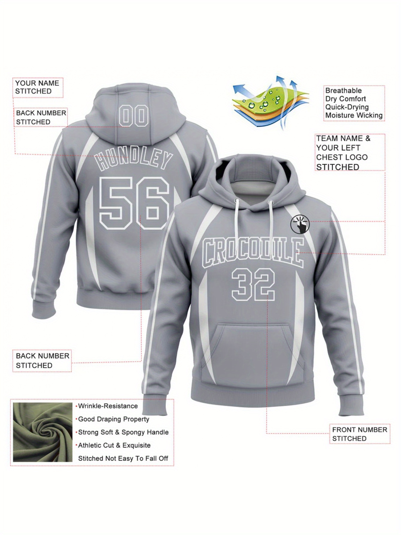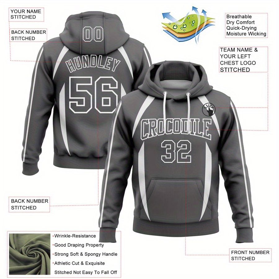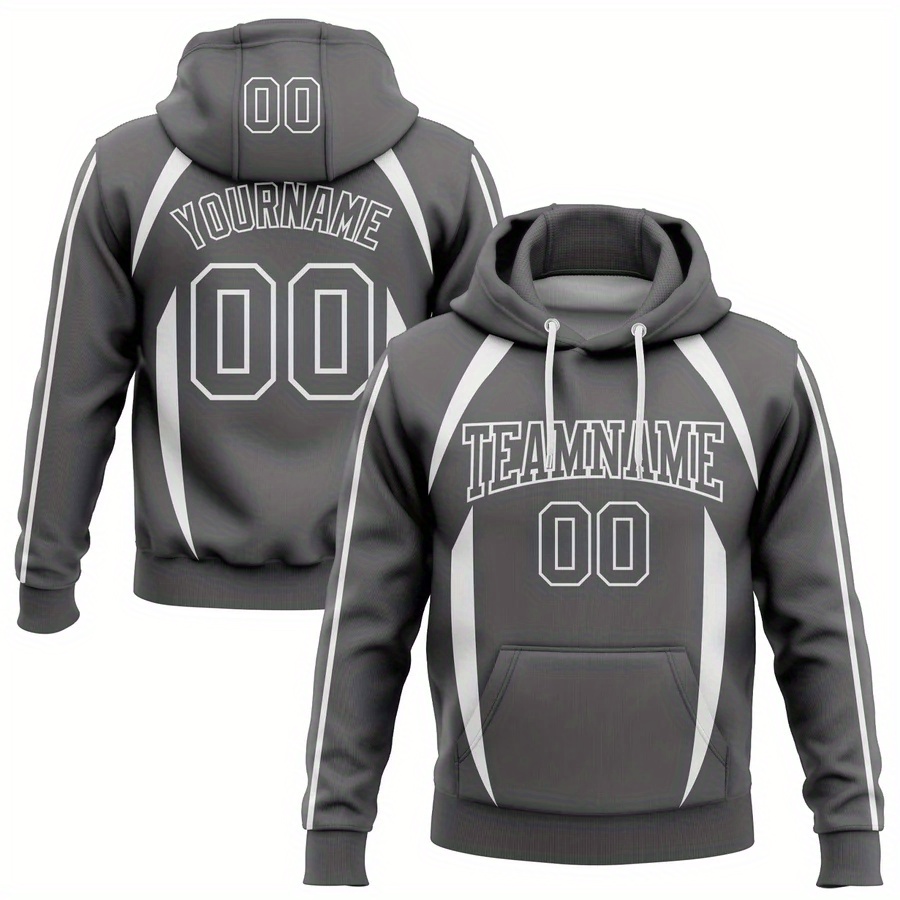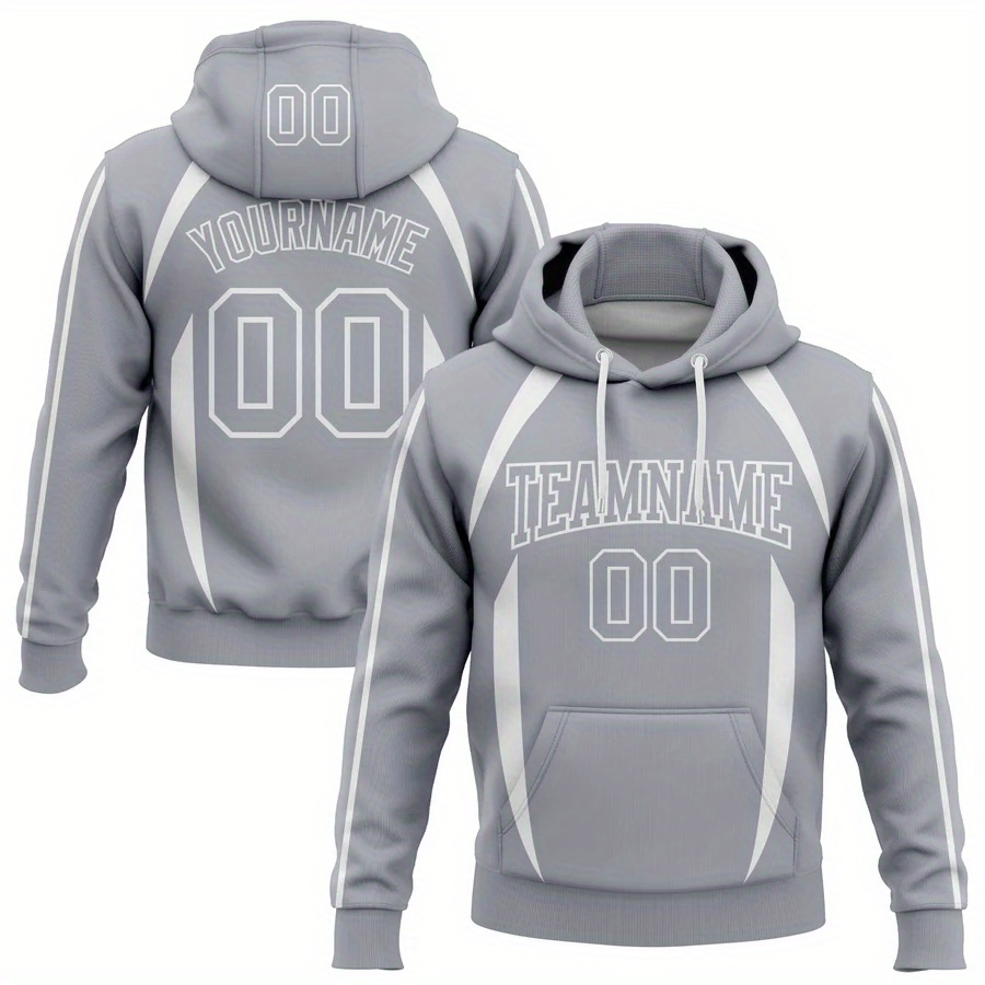 Customizable Men'S Plus Size Hoodie - Personalized "YOURNAME" & "TEAMNAME" with Number 00, Gray with White Stripes, Casual Sporty Design, Polyester Blend, Machine Washable, PLUS SIZE
