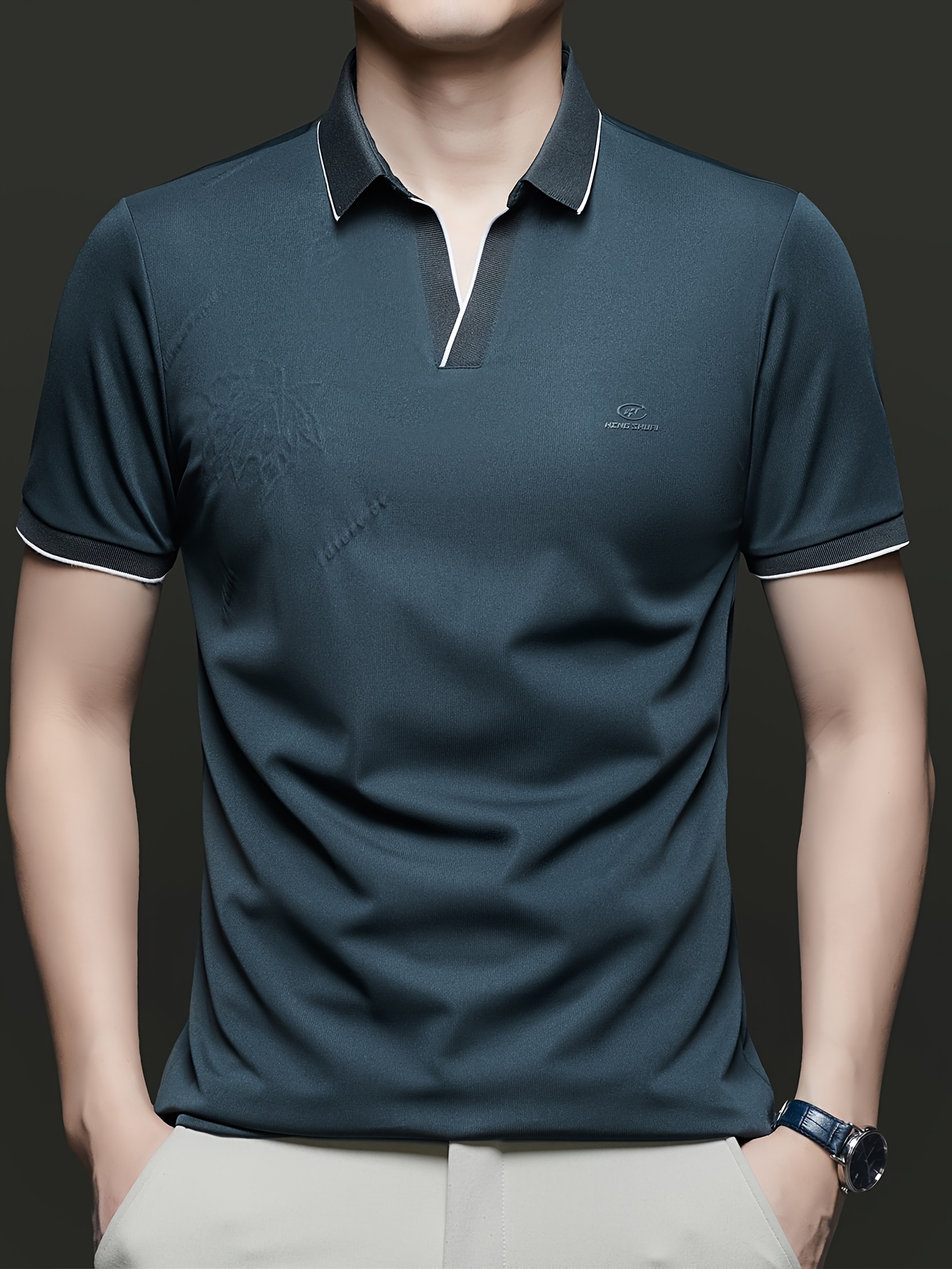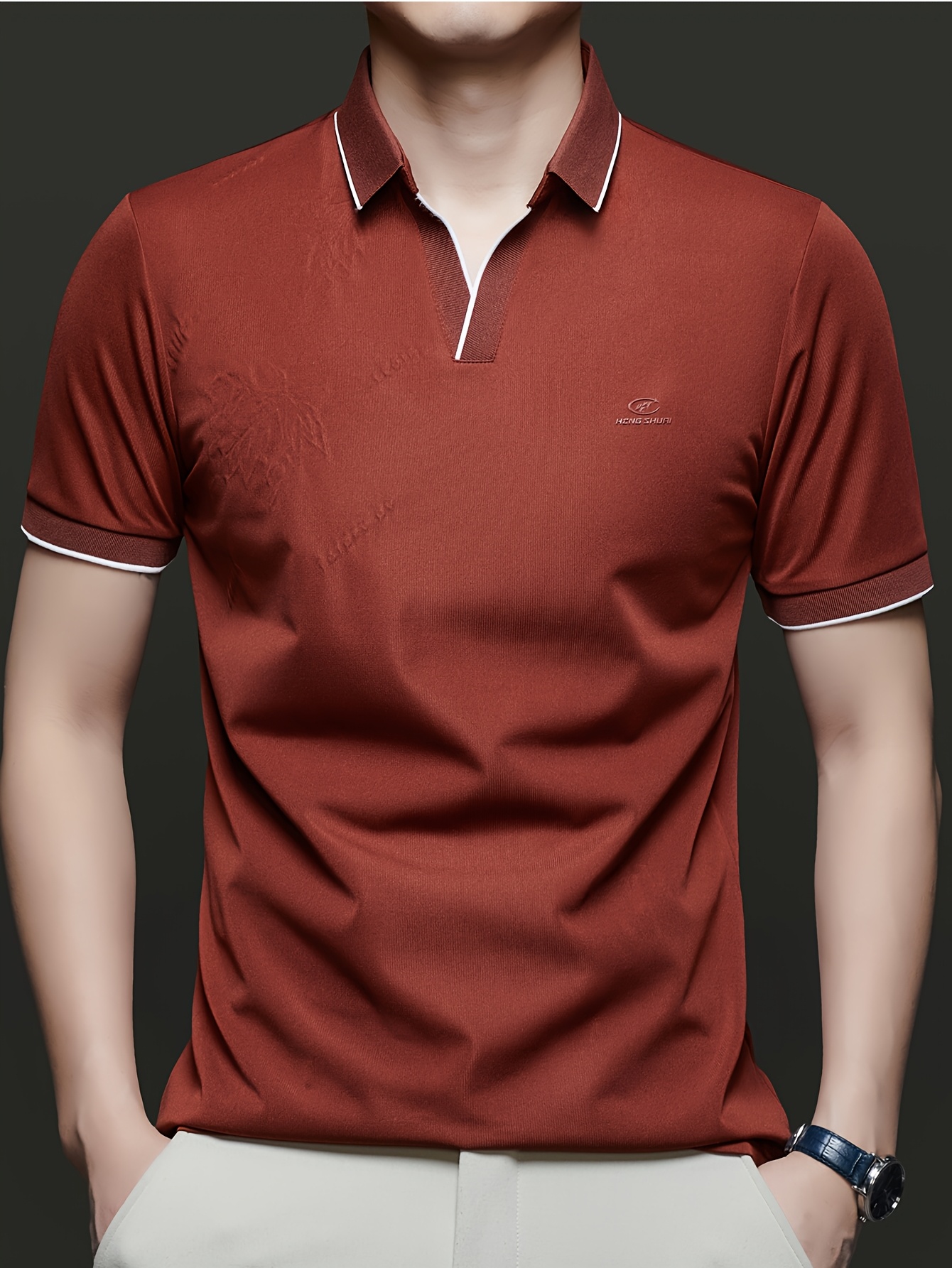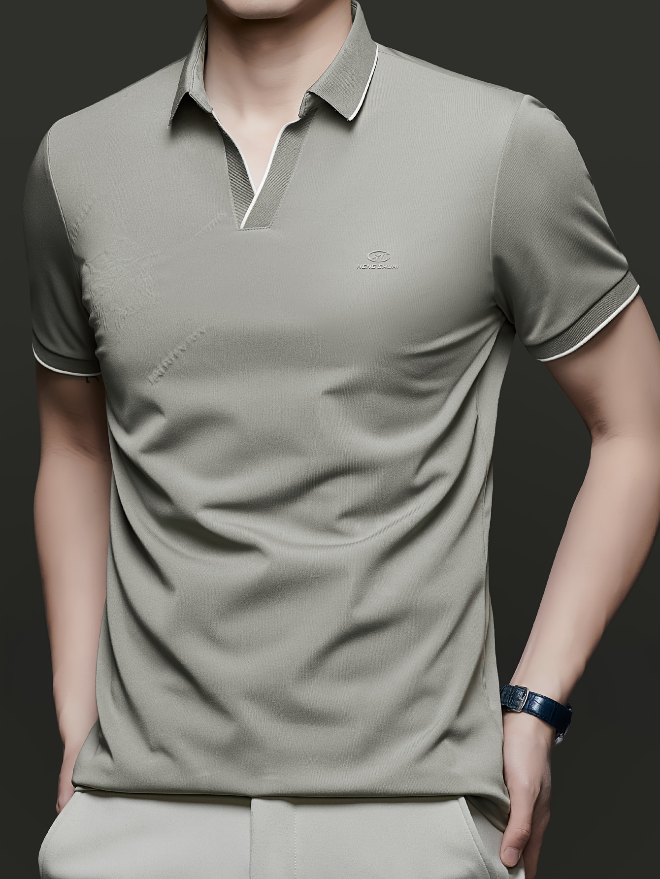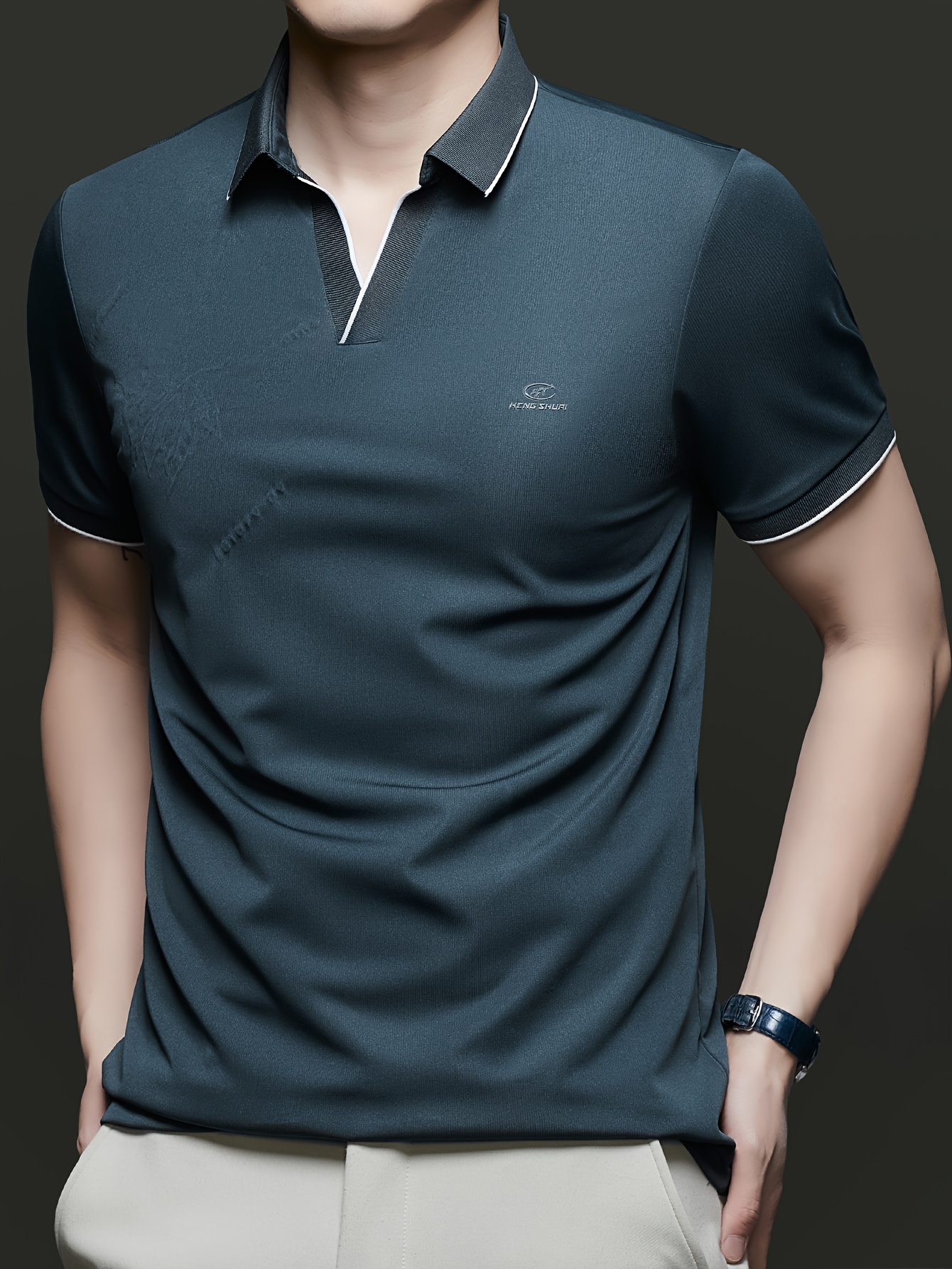 Men's Summer Short-Sleeve Collar Knit Shirt - Breathable V-Notch Blouse, Machine-Washable Casual & -Casual Tunic Top, Color-Blocking Trim (Short T) for Spring/Summer - In Stock 2518