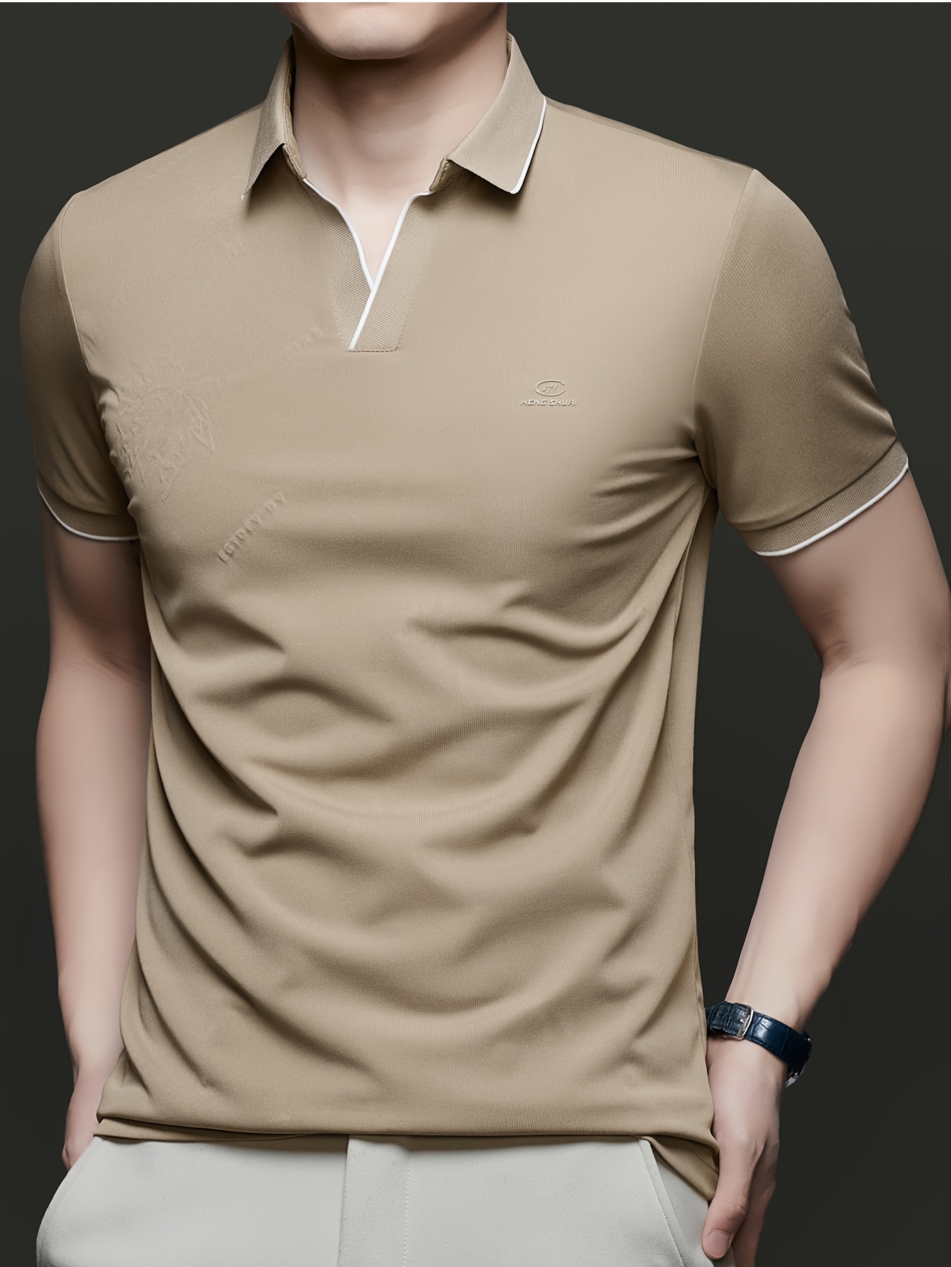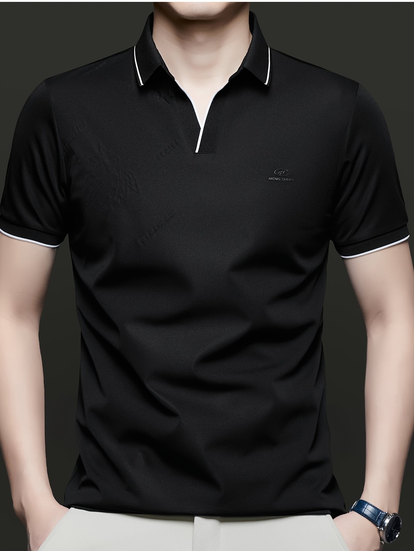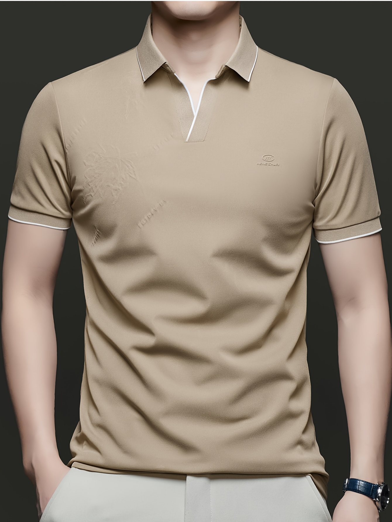 Men's Summer Short-Sleeve Collar Knit Shirt - Breathable V-Notch Blouse, Machine-Washable Casual & -Casual Tunic Top, Color-Blocking Trim (Short T) for Spring/Summer - In Stock 2518