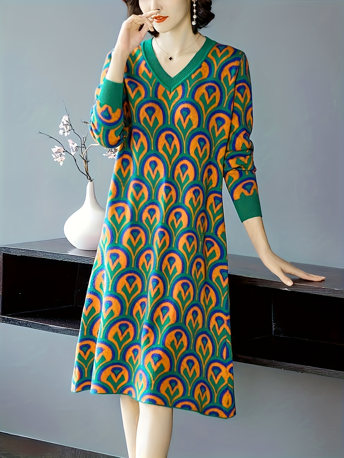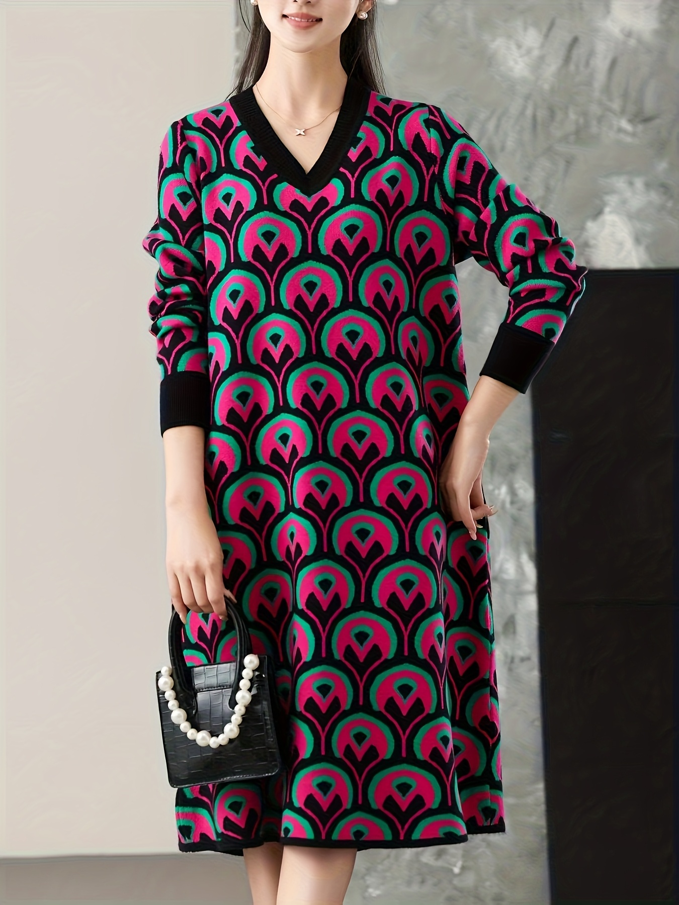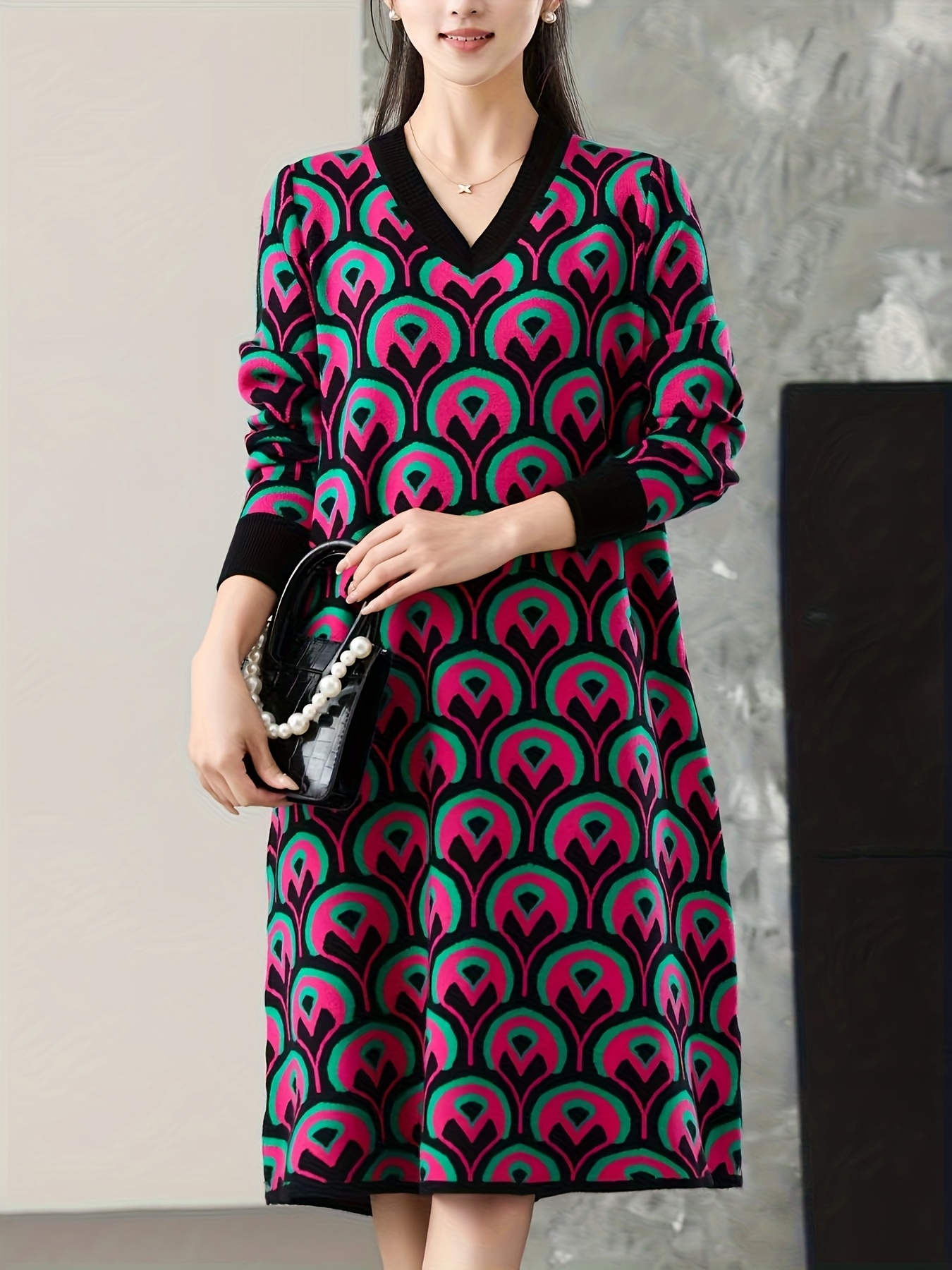 Plus Size - Plus Size Women'S V-Neck Sweater Dress | Mid-Length, Geometric Pattern, Stretchy Fabric, Regular Fit for Fall/Winter, Ideal for Office and Party Wear