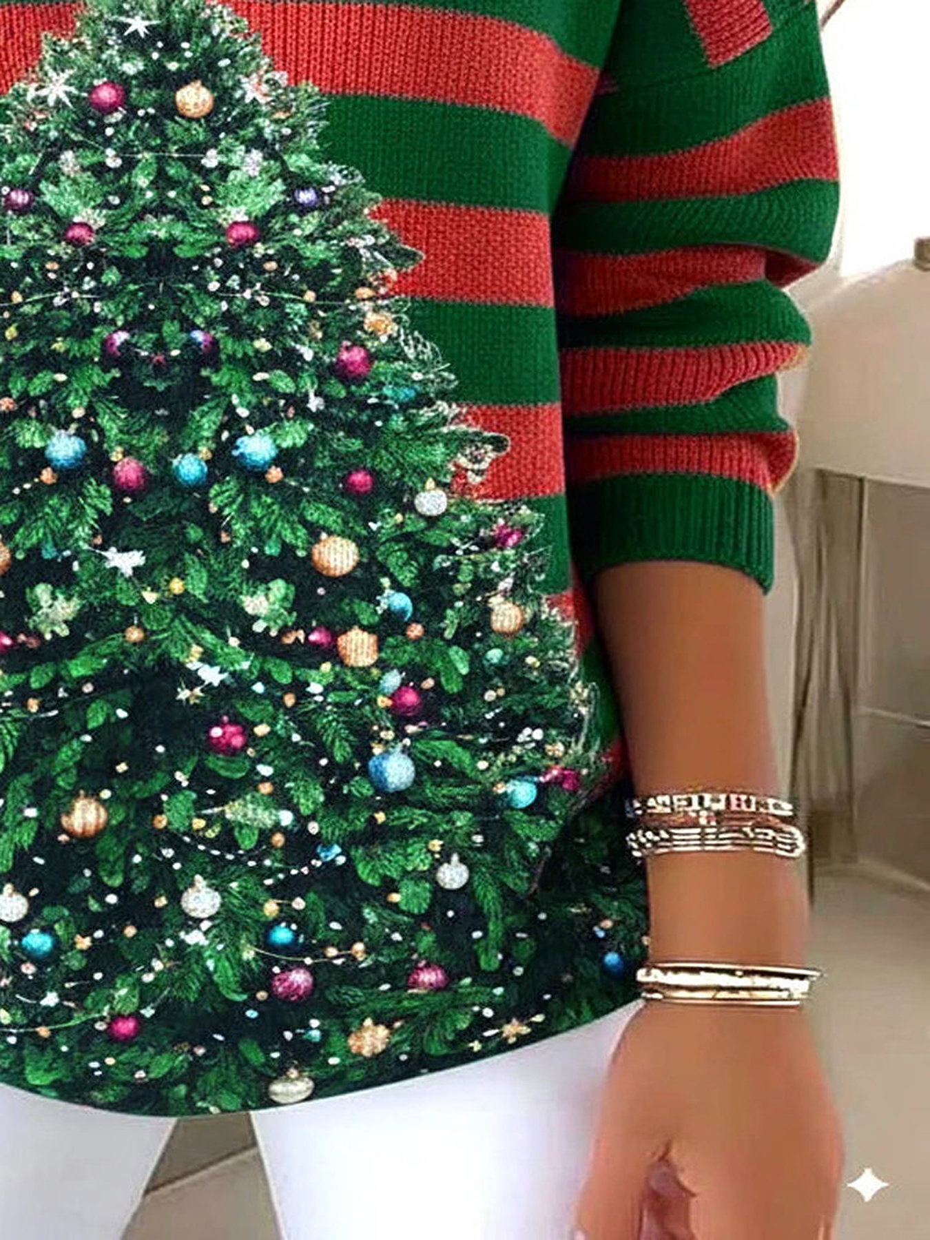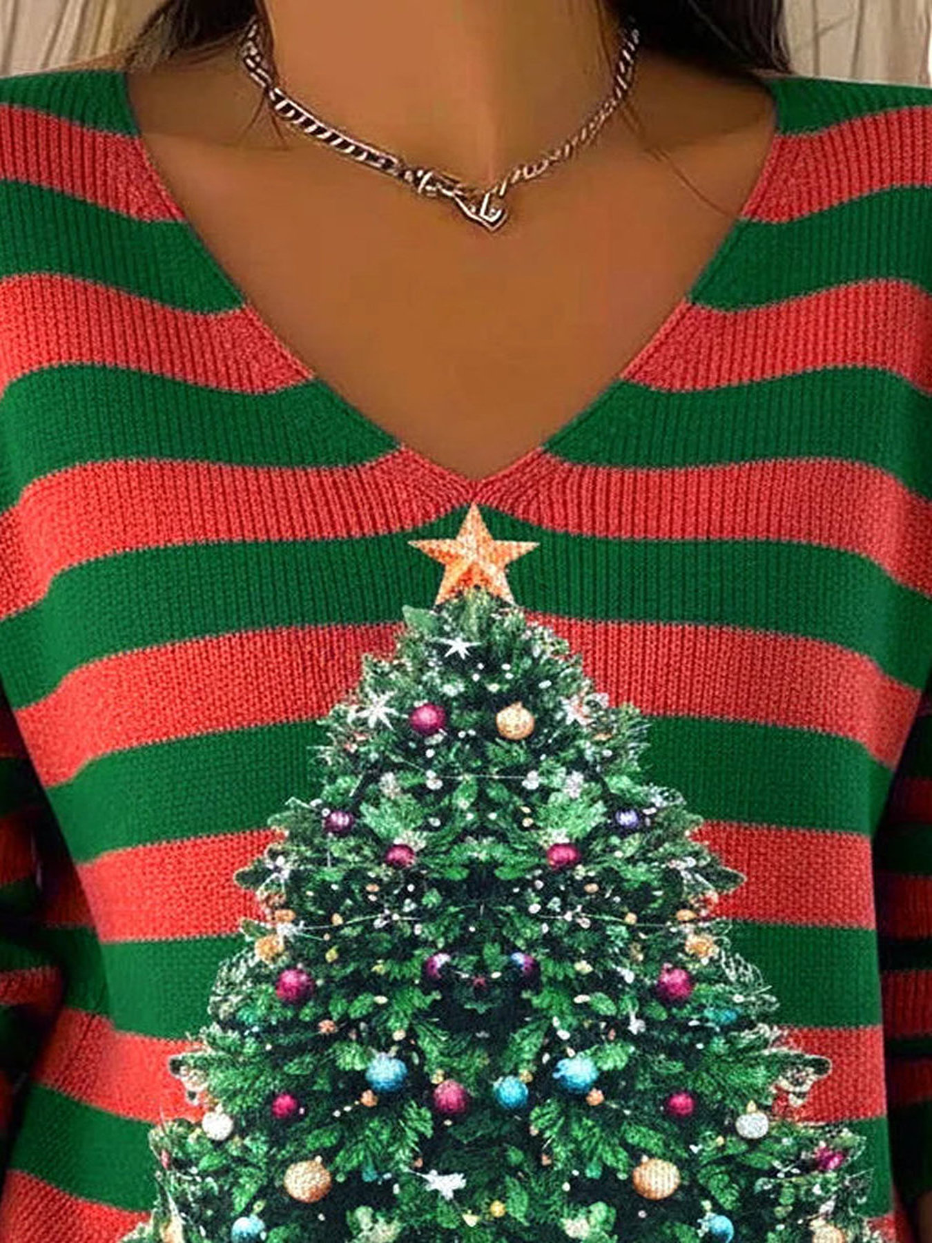 Plus Size - Women'S Large Christmas Tree Print Sweater - Oversized V-Neck Long Sleeve Pullover with Festive Red & Green Striped Pattern, Cozy Loose Fit Winter Sweater for Holiday Parties & Casual Outfits, Soft Warm Fabric (Ideal Christmas Gift) - Pl