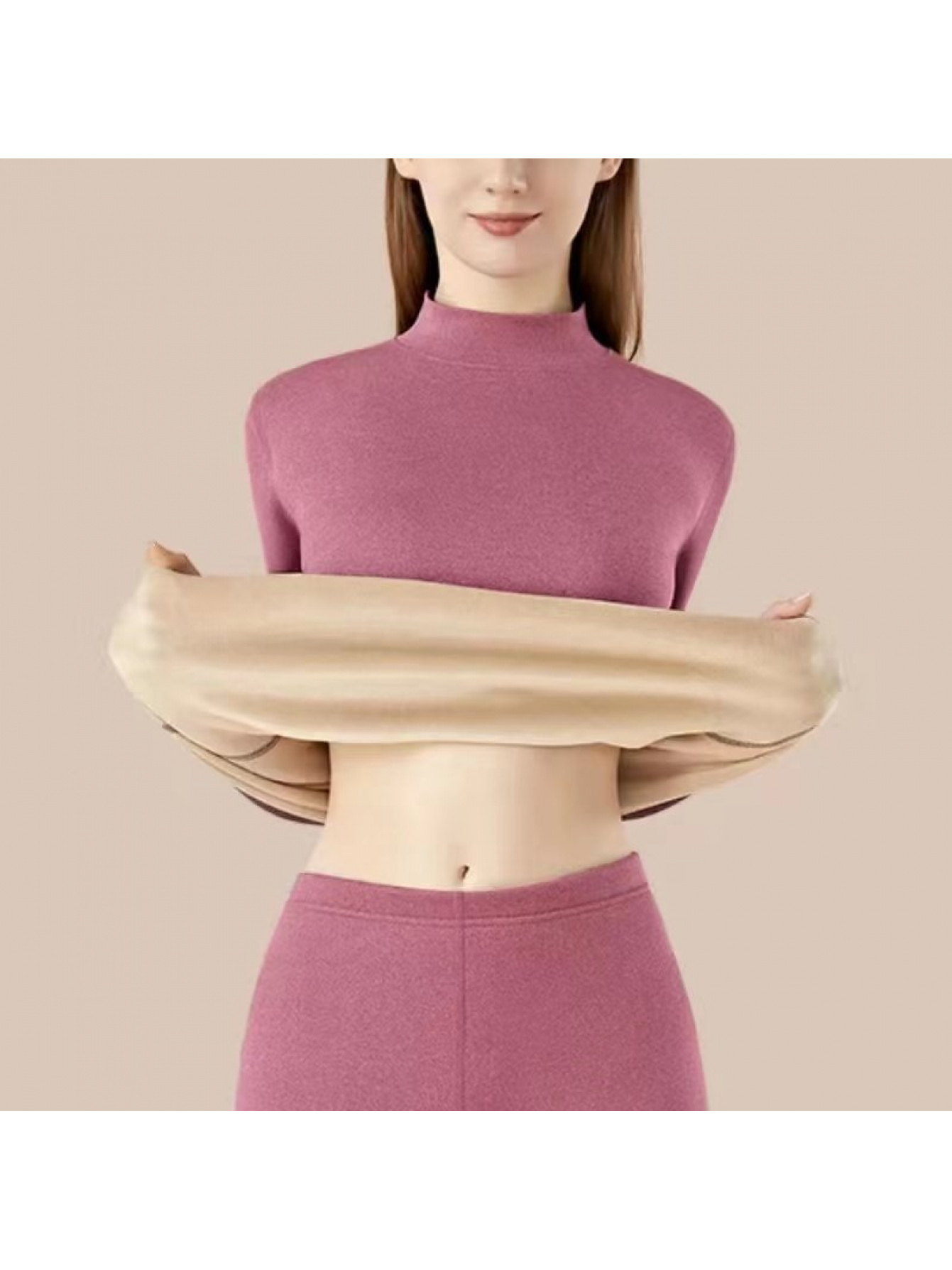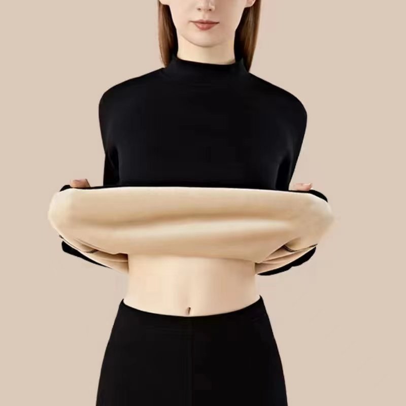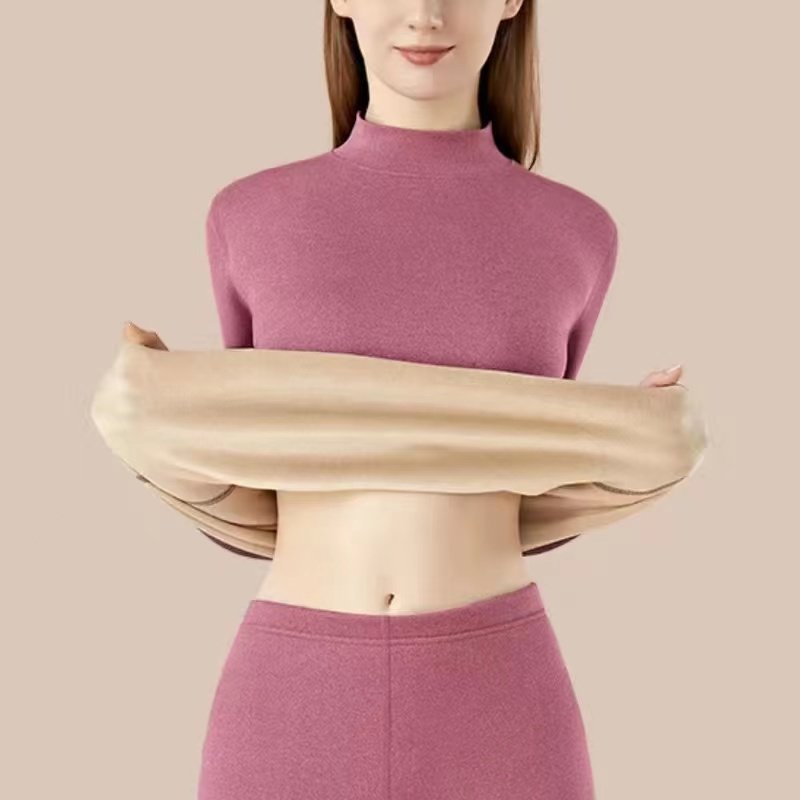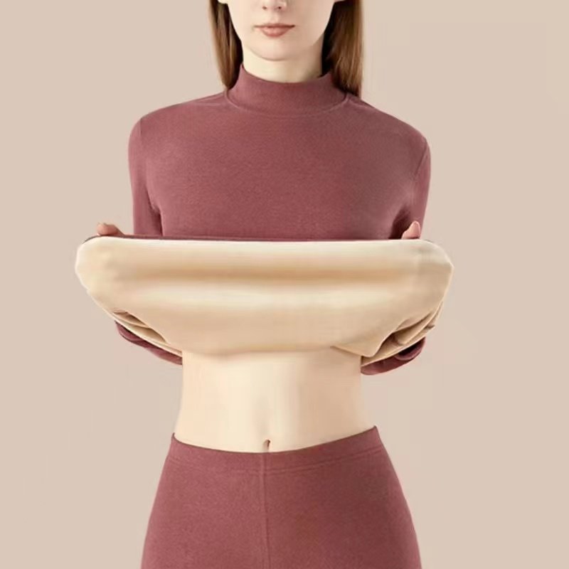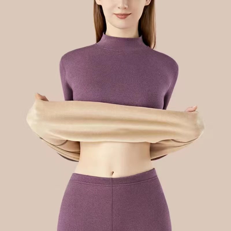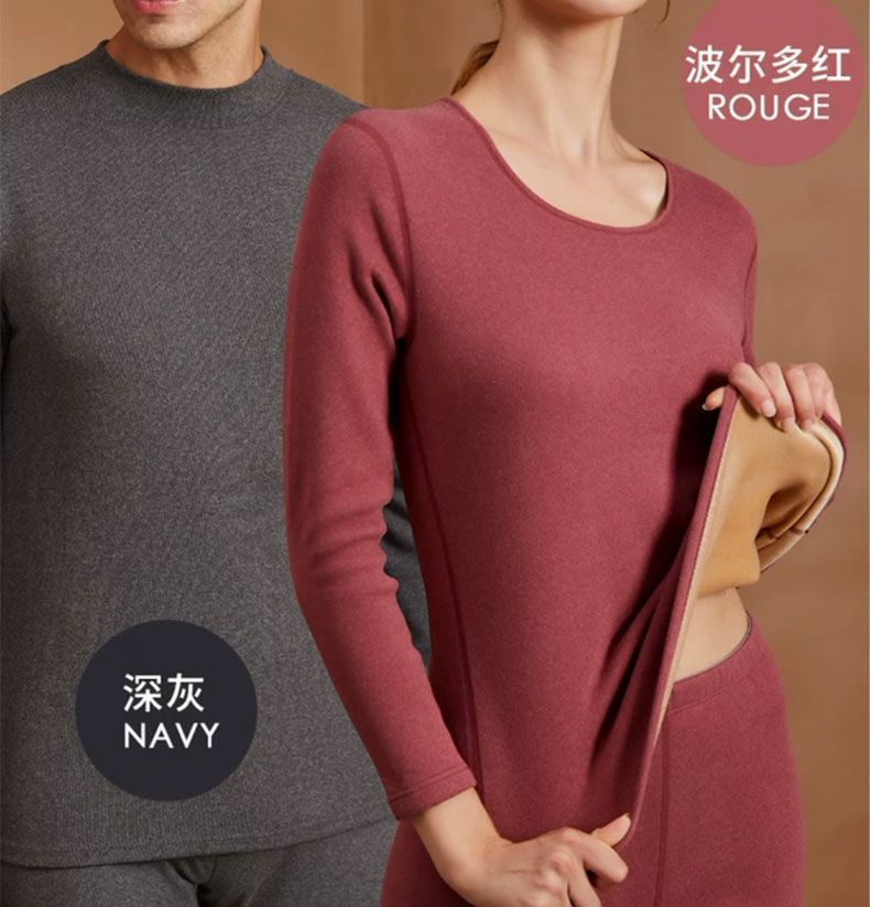 Plus Size - Women'S Thermal Underwear Set - Fleece-Lined Thickened Winter Panties, Full Coverage Round Neck Base Layer, Soft Stretchy Fabric for Cold Weather, Everyday & Formal Wear, Cozy Warmth, Seamless Design, Layering Essentials (Solid Color)