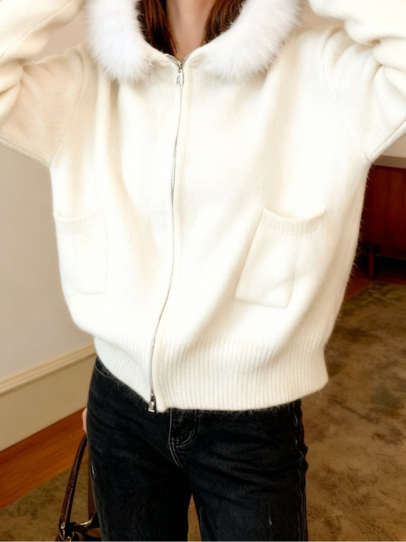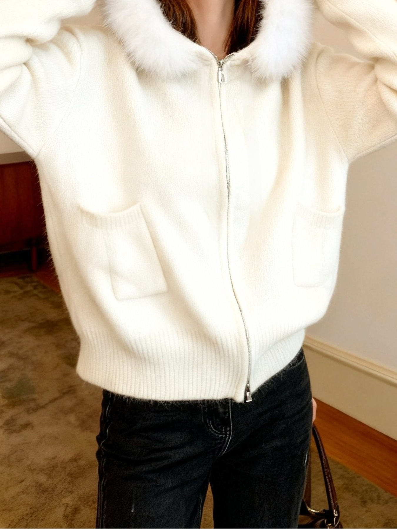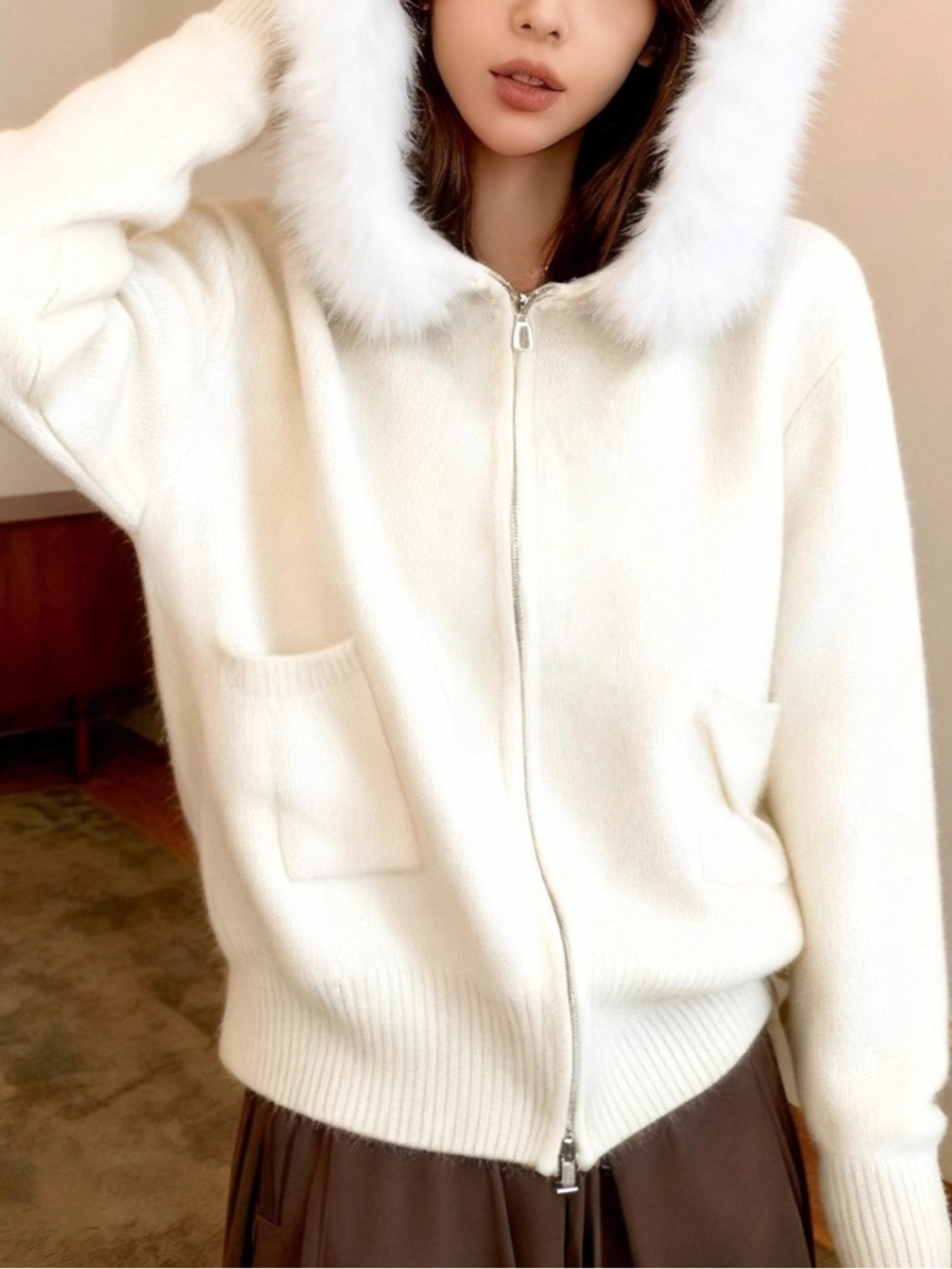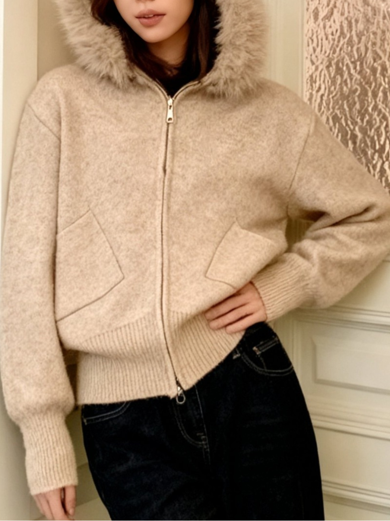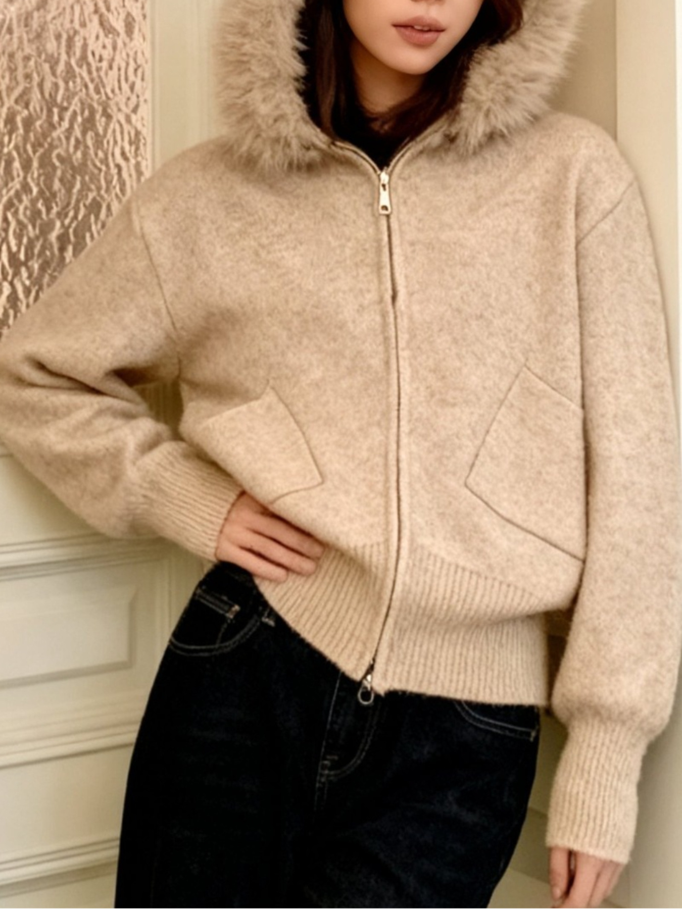 Women'S Korean Winter Jacket with Fur Collar - Loose Fit Hooded Coat, /All-Season Outerwear for Casual & Formal Events, Easy-Care Cardigan Sweater (Women'S Clothing)