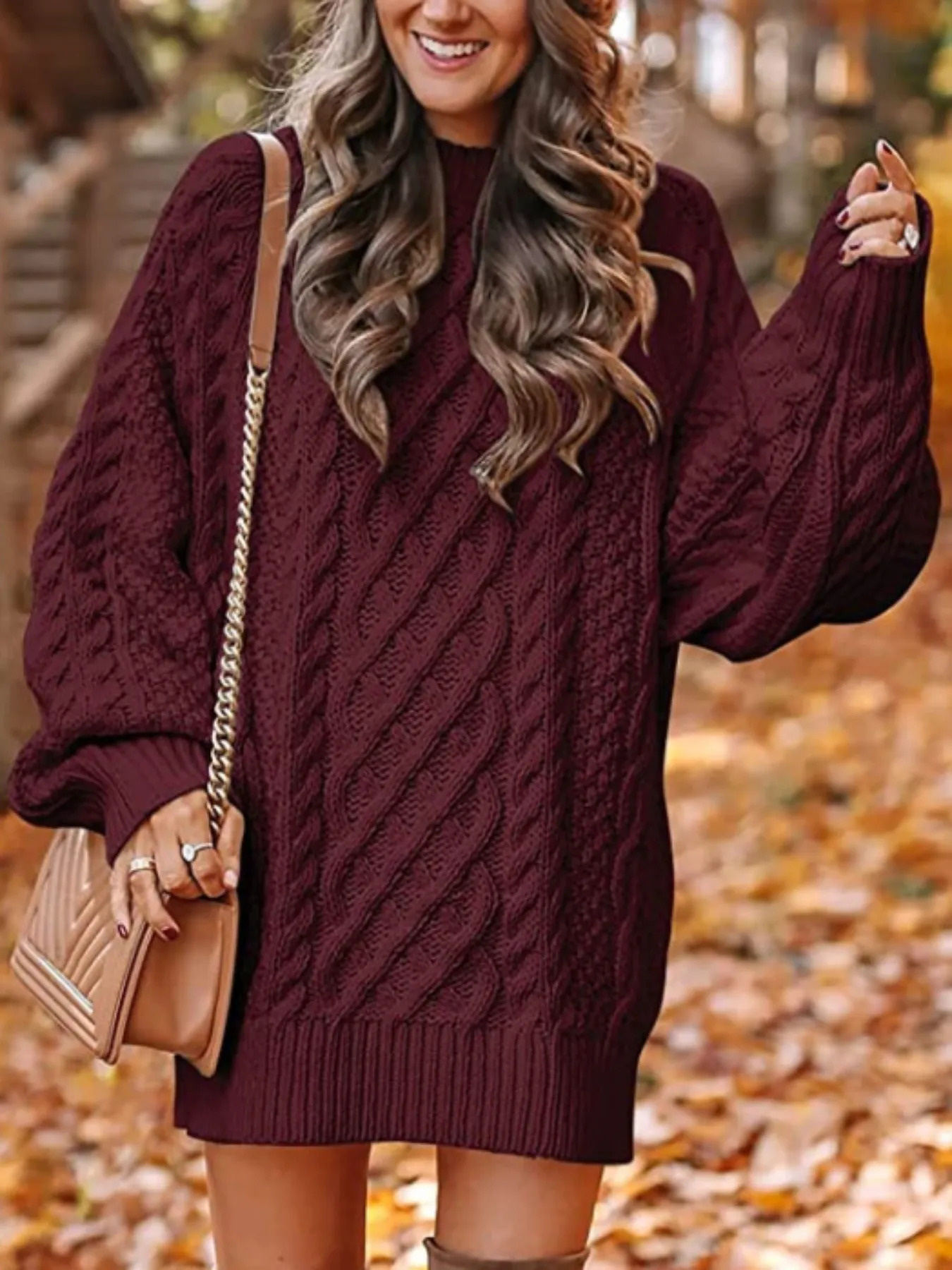 Women's Oversized Cable Sweater Dress - Belted Waist Pencil, Round Neck Mid-Length Pullover, Cozy Casual to Semi-Formal Wear (Maroon/Deep Red) - Easy-Care Hand Wash/Dry Clean, Spring/Fall Wardrobe Essential