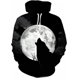 Men's Wolf and Full Moon Pattern Hoodie- Streetwear Pullover Sweatshirt with Hood, Long Sleeve Autumn Winter Cold Weather Jacket, Adjustable Zipper Hood- Men's Urban Outdoor Clothing, Casual Wear, Strong Print, Comfortable Fabric, Casual Wear, PLUS