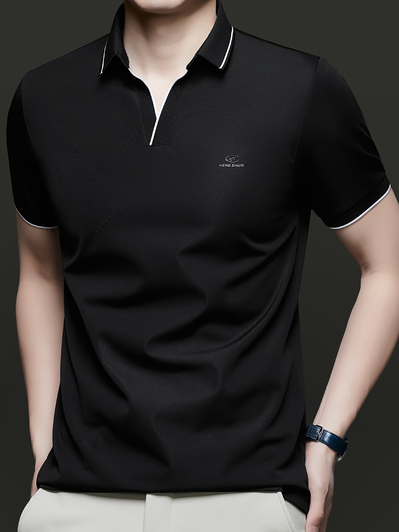 Men's Summer Short-Sleeve Collar Knit Shirt - Breathable V-Notch Blouse, Machine-Washable Casual & -Casual Tunic Top, Color-Blocking Trim (Short T) for Spring/Summer - In Stock 2518