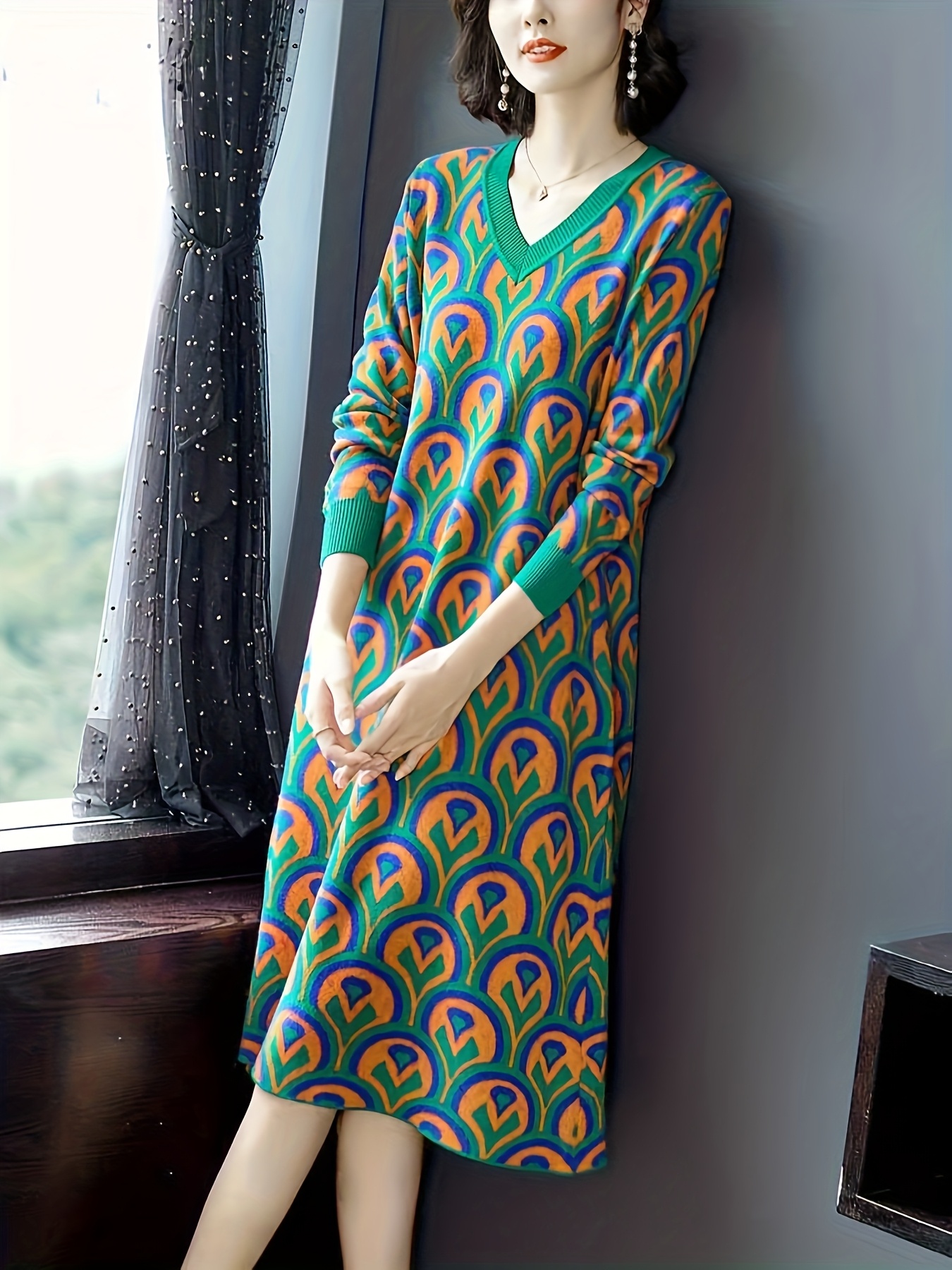 Plus Size - Plus Size Women'S V-Neck Sweater Dress | Mid-Length, Geometric Pattern, Stretchy Fabric, Regular Fit for Fall/Winter, Ideal for Office and Party Wear